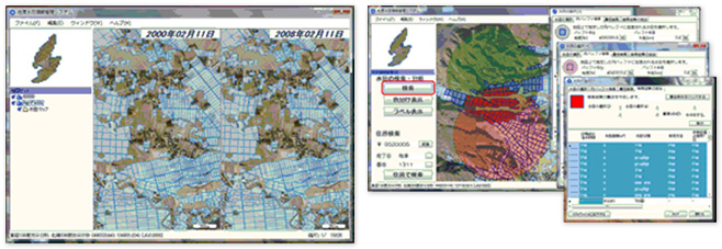 The satellite image of the entire Sado area and the paddy field polygons are displayed in a superimposed manner, and paddy fields can be searched using geographical and attribute conditions.Used for research and analysis of paddy field environment suitable for habitat of ibis. It mainly has the following functions.